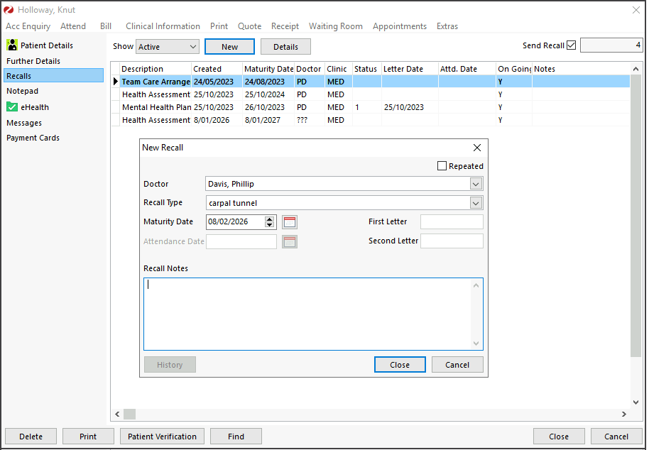 Zedmed recommends creating a new record for a recall; do not reuse the original recall by advancing the Maturity Date. This will cause your practice to lose its medico-legal record of the original recall. To learn more about recalls, see the Admin section