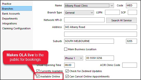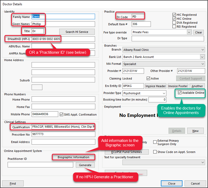 Select Practice Setup > Doctors > Find Treating Doctors then Find and open the doctor. - Enable the practitioner for OLA by selecting the Available Online tickbox.