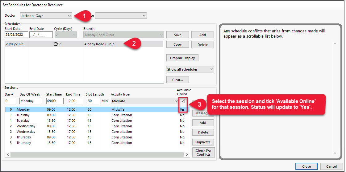 Important: check that all active schedules have been reviewed and the session made available as required. - Repeat all of these steps for each doctor.