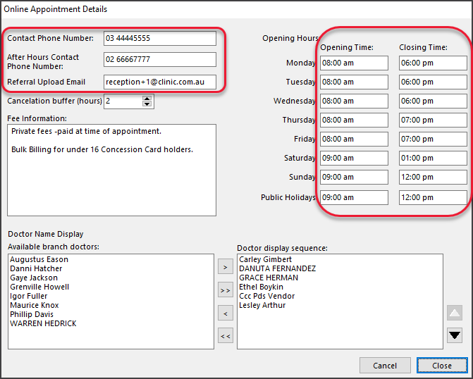 The optional setting allows you to set a time buffer (in hours) within which the patient cannot cancel or change an Online Appointment. If they try, a message will advise that the appointment cannot be altered. Set the number of hours for the Cancellation buffer (hours) in Office, for example, '2'. Requires Zedmed v38.8 or later. - Doctors Name Display (Zedmed v28 and later)