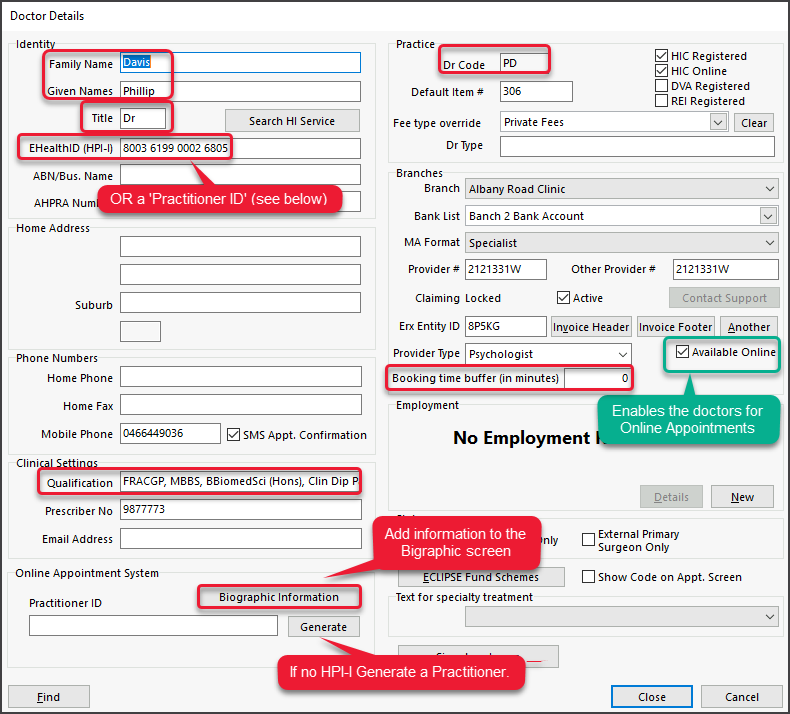 - The following information must be in the Doctor's Details, or their appointments will not appear: