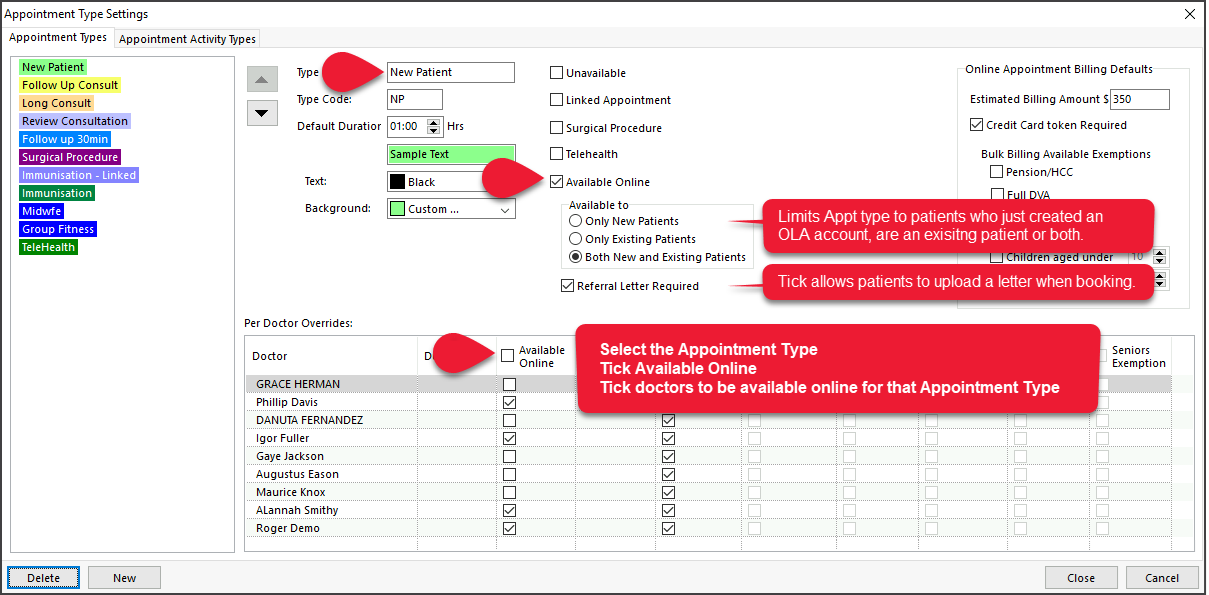 To set up a doctor for Online Appointments: