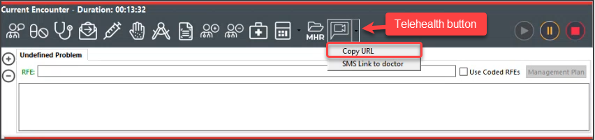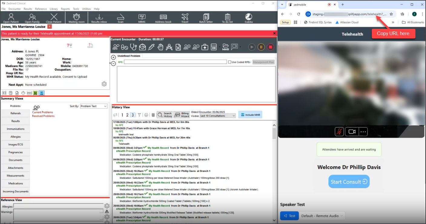 This opens the patient's clinical record and starts the Current Encounter in Zedmed. - The practitioner selects Telehealth from the Current Encounter menu and chooses Copy URL